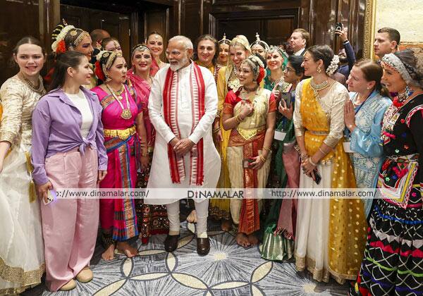 பிரதமர் மோடியுடன் புகைப்படம் எடுத்துக் கொண்ட ரஷ்ய கலாசார குழுவினர்.