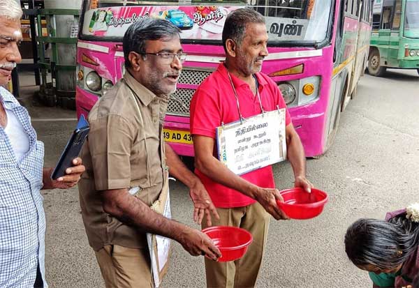 ஸ்டிரைக்கில் ஈடுபட்டுள்ள அரசு பஸ் தொழிலாளர்கள், திருநெல்வேலியில் பிச்சை எடுக்கும் போராட்டம் நடத்தினர்.