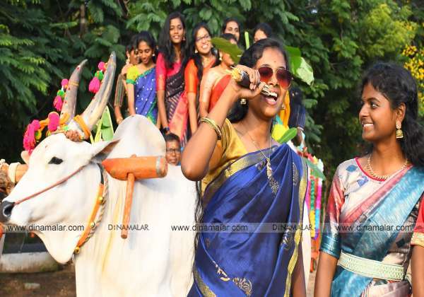 கோவை வேளாண் பல்கலையில் நடந்த பொங்கல் விழாவில் மாட்டு வண்டியில் வந்து கொண்டாடிய மாணவர்கள்