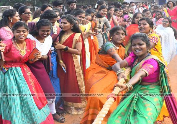 கோவை வேளாண் பல்கலையில் நடந்த பொங்கல் விழாவில் கயிறு இழுக்கும் போட்டியில் உற்சாகமாக கலந்து கொண்ட மாணவர்கள்.