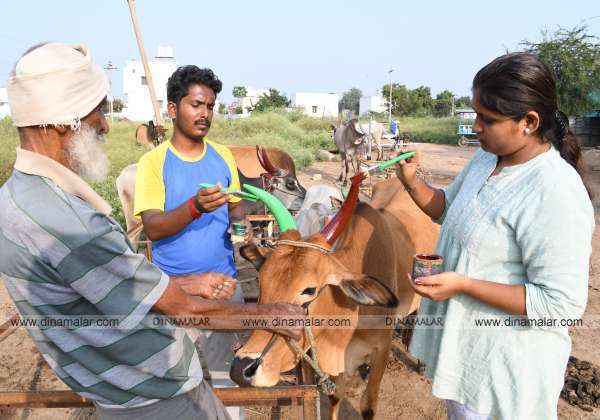 மாட்டுப் பொங்கலை கொண்டாடுவதற்க்காக மாடுகளின் கொம்புகளுக்கு வர்ணம் தீட்டுகின்றனர்.இடம்.உடுமலை.