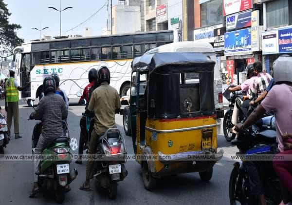 கோவை அவினாசி ரோடு தண்டு மாரியம்மன் கோவில் எதிரே யு டேன் செய்ய சிரமப்படும் பஸ்கள்.