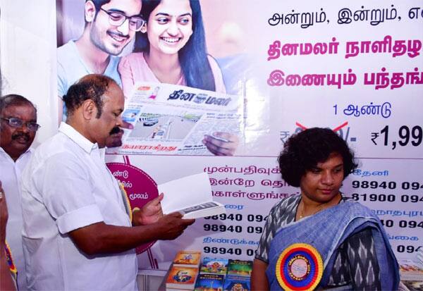 சிவகங்கையில் மாவட்ட நிர்வாகம், பள்ளிக்கல்வித்துறை, பொது நூலக இயக்கம் மற்றும் பாபாசி இணைந்து ஏற்பாடு செய்த புத்தகத் திருவிழாவை துவக்கி வைத்த அமைச்சர் பெரிய கருப்பன், தினமலர் நாளிதழ் அரங்கத்தை பார்வையிட்டார். அருகில் கலெக்டர் ஆஷா அஜித்.
