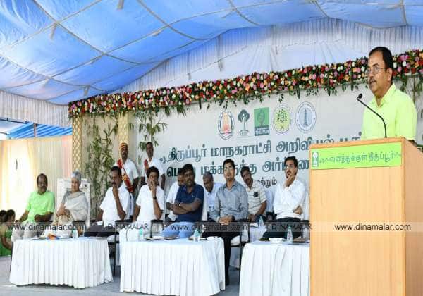 திருப்பூர், மாநகராட்சி அறிவியல் பூங்கா மக்கள் பயன்பாட்டிற்கு அர்ப்பணிப்பு விழாவில் வெற்றி அமைப்பு தலைவர் சிவராம் பேசினார். (வலமிருந்து) மாநகராட்சி கமிஷனர் பவன்குமார், கலெக்டர்கள் கிராந்திகுமார், கிரிஸ்துராஜ், மேயர் தினேஷ்குமார், ஊராட்சி தலைவர் கணேசன், சிறுதுளி அமைப்பு நிர்வாக அறங்காவலர் வனிதா மோகன், ராயல் கிளாசிக் நிறுவன தலைவர் கோபாலகிருஷ்ணன்.