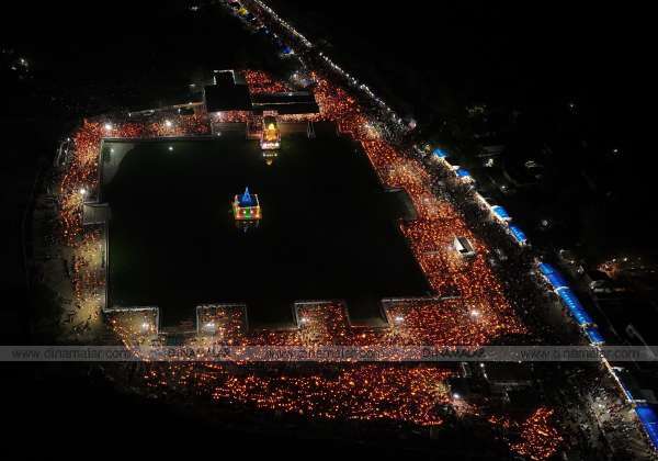 கழுகு பார்வையில் தெப்பத் திருவிழா சிவகங்கை மாவட்டம் திருக்கோஷ்டியூர் சவுமிய நாராயண பெருமாள் கோயில் மாசி தெப்ப உற்சவ விழா இரவில் ஜொலித்தது.