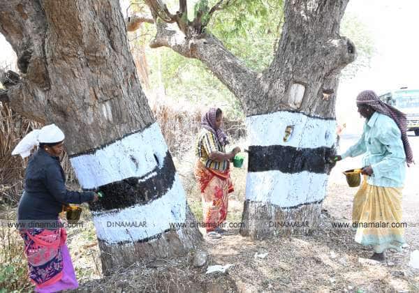 உடுமலை - திருப்பூர் ரோட்டில் உள்ள மரங்களுக்கு நெடுஞ்சாலைதுறை சார்பில் வெள்ளை,கருப்பு வர்ணம் அடிக்கும் தொழிலாளர்கள்.