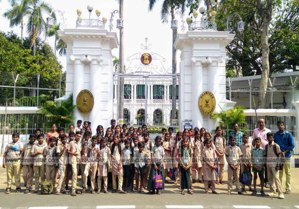 புதுச்சேரிக்கு வந்த விழுப்புரம் மாவட்டம் கம்மாபுரம் ஒன்றியம் உய்யக்கொண்டராவி ஊராட்சி ஒன்றிய நடுநிலைப்பள்ளி மாணவ மாணவியர் கவர்னர் மாளிகை முன்பு புகைப்படம் எடுத்து மகிழ்ந்தனர்.