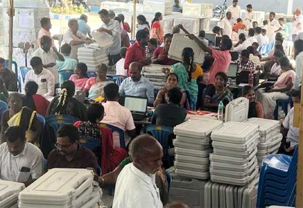 திருவண்ணாமலை கலெக்டர் அலுவலக வளாகத்தில் உள்ள மின்னணு ஓட்டுப்பதிவு இயந்திர பாதுகாப்பு கிடங்கில் இருந்து தொகுதிகளுக்கு கூடுதலாக தேவைப்படும் மின்னணு ஓட்டுப்பதிவு இயந்திரங்கள் அனுப்பும் பணியில் அரசு ஊழியர்கள் ஈடுபட்டனர்