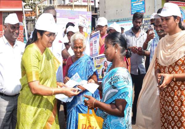 லோக்சபா தேர்தலை முன்னிட்டு திண்டுக்கல் பஸ் ஸ்டாண்டில் வாக்காளர்களிடையே விழிப்புணர்வு ஏற்படுத்தும் வகையில் துண்டு பிரசுரங்களை கலெக்டர் பூங்கொடி வழங்கினார்.