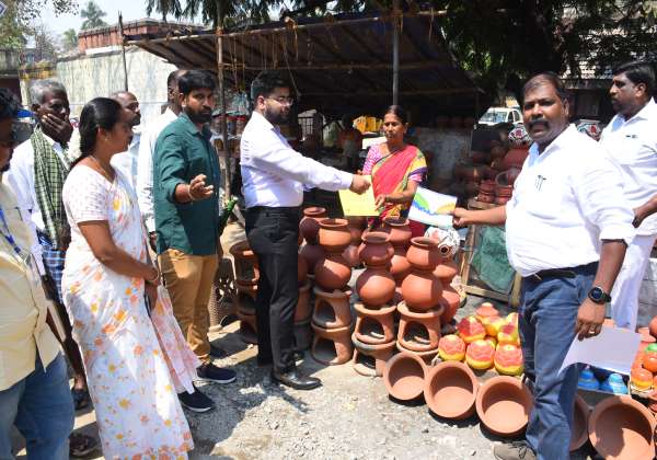 திண்டிவனத்தில் நூறு சதவீதம் வாக்குப்பதிவு குறித்து விழிப்புணர்வு துண்டு பிரசுரங்களை சப்_ கலெக்டர் திவ்யான் சு நிகாம் வியாபாரிகளுக்கு வழங்கினார். அருகில் தாசில்தார் பாலமுருகன்.