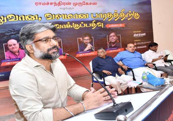 திருப்பூர், அடுத்த பல்லடத்தில் ராமச்சந்திரன் முருகேசன் வழங்கும் வலுவான, வளமான பாரதத்திற்கு 100% வாக்குப் பதிவு குறித்து கருத்தரங்கம் நடந்தது. இதில் பத்திரிகையாளர் பி.ஆர் சீனிவாசன் பேசினார்.