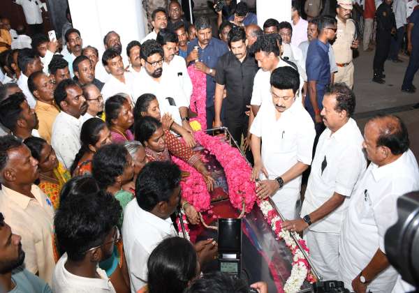விழுப்புரம் கலைஞர் அறிவாலயத்தில் உடல்நலம் குறைவால் இறந்த விக்கிரவாண்டி தொகுதி எம்.எல்.ஏ. புகழேந்தி உடல் அஞ்சலிக்கு வைக்கப்பட்டுள்ளது. இங்கு வந்த முதல்வர் ஸ்டாலின் புகழேந்தி உடலுக்கு மலர் வளையம் வைத்து அஞ்சலி செலுத்தினார். அருகில் அமைச்சர்கள் பொன்முடி, அன்பில் மகேஷ் பொய்யாமொழி, கவுதம் சிகாமணி எம்.பி.