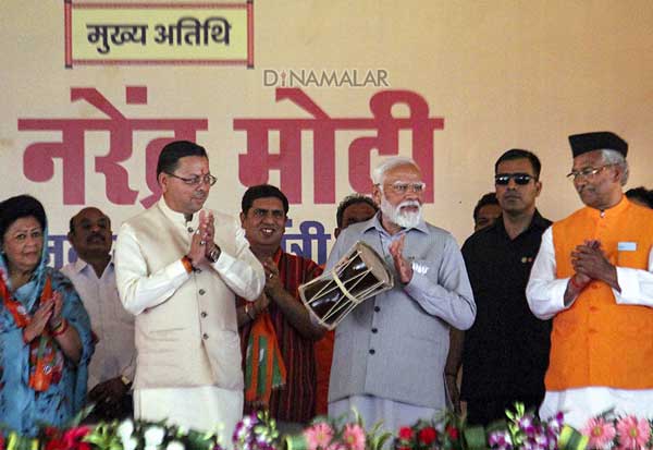 உத்தரகண்ட் மாநிலம் ரிஷிகேஷில் நடந்த தேர்தல் பிரசாரத்தில் பிரதமர் மோடி மேடையில் உறுமி மேளம் தட்டி ரசித்தார்.