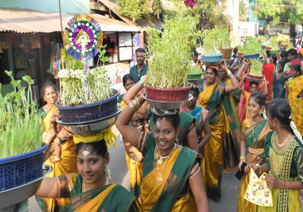 அல்லிநகரம் சடையாண்டி கோயில் பங்குனி உத்திரம் திருவிழாவை முன்னிட்டு முளைப்பாரி எடுத்து ஊர்வலம் சென்ற பெண்கள்.