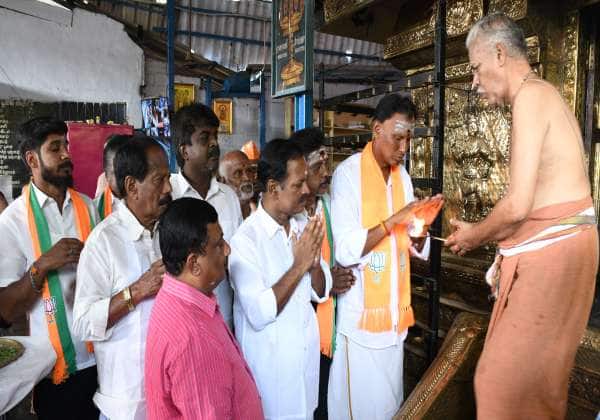 கோவை போத்தனூர் கடைவீதியில் அய்யப்பன் கோவிலில் சாமி தரிசனம் செய்த பா.ஜ., வேட்பாளர் வசந்தராஜன்.
