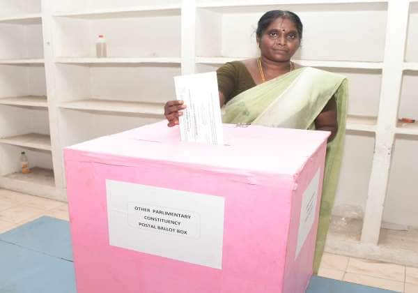 தாம்பரம் ஜெயகோபால் கரோடியா பள்ளியில் தேர்தல் பணியில் ஈடுபடும் பணியாளர்கள் தங்கள் தபால் ஓட்டுகளை போட்டனர்.