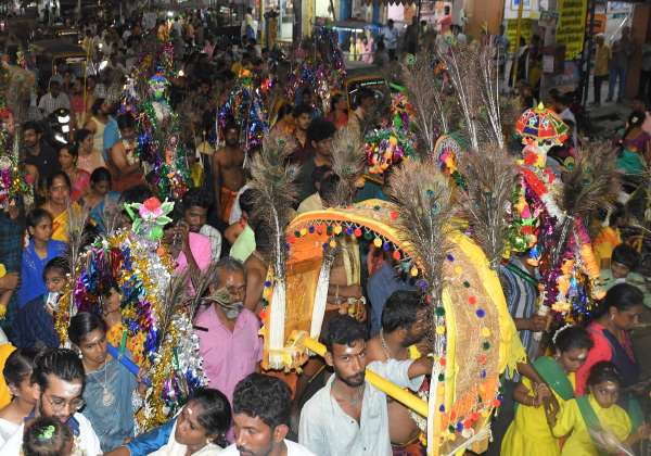 சித்திரை திருவிழாவை முன்னிட்டு அல்லிநகரம் வீரப்ப அய்யனார் கோயிலில் இருந்து பங்களா மேடு சோலை மலை அய்யனார் கோயிலுக்கு காவடி எடுத்து சென்ற பக்தர்கள்.