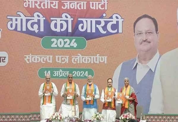 பா.ஜ., தேர்தல் அறிக்கையை பிரதமர் மோடி, மத்திய அமைச்சர்கள் அமித்ஷா, ராஜ்நாத் சிங், நிர்மலா சீதாராமன் ஆகியோர் கூட்டாக வெளியிட்டனர். இடம்: புதுடில்லி
