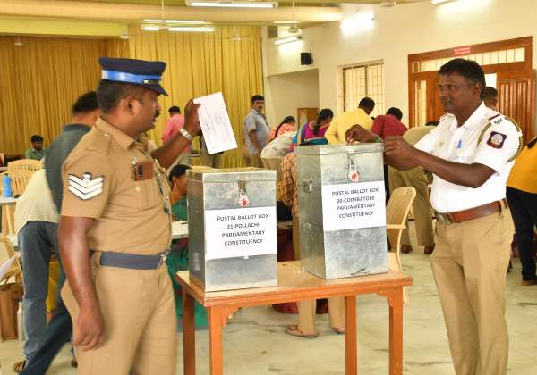 கோவை உப்பிலிபாளையம், சமுதாய கூடத்தில் தபால் ஓட்டு போடும் போலீசார்.