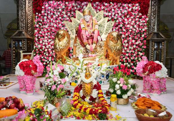கோவை ஸ்ரீ நாக சாய் மந்திர் கோயிலில் தங்க ஆபரணங்களில் அலங்கரிக்கப்பட்ட சாய் பாபா.