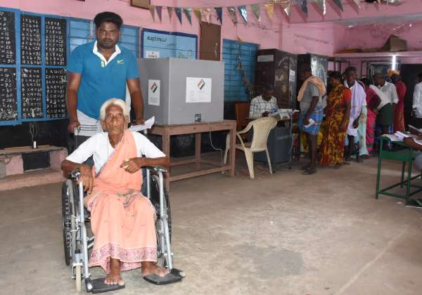 கடலூர் அடுத்த குமளங்குளம் ஊராட்சி ஒன்றிய துவக்கப் பள்ளி ஓட்டுச்சாவடியில் 95 வயது பாட்டி வீல் சேரில் வந்து ஓட்டளித்தார்.