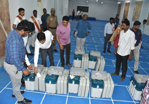 கோவை பாராளுமன்ற தொகுதியில் பதிவான வாக்கு பெட்டிகள் பல போலீஸ் பாதுகாப்புடன், கோவை அரசு தொழில் நுட்ப கல்லூரிக்கு கொண்டு வரப்பட்டு, அதனை ஸ்டாரங் ரூமில் அடுக்கி வைக்கப்பட்டதை தேர்தல் நடத்தும் அதிகாரி கிராந்தி குமார் பார்வையிட்டார். அருகில் மாநகராட்சி ஆணையாளர் சிவகுரு பிரபாகரன் உள்ளிட்டோர்