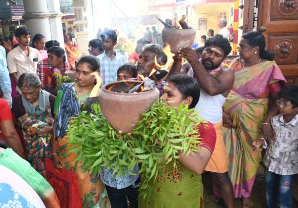 உடுமலை மாரியம்மன் கோயில் தேர் திருவிழாவையொட்டி அக்னி சட்டி எடுத்து நேர்த்திக்கடன் செலுத்தும் பக்தர்கள் .