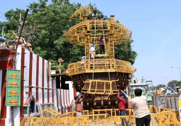 உடுமலை மாரியம்மன் கோவில் திருவிழாவையொட்டி தேருக்கு அடுக்குகள் அமைக்கும் பணியில் தொழிலாளர்கள் ஈடுபட்டு உள்ளனர்.