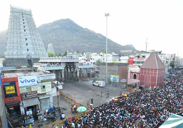 சித்ரா பௌர்ணமியை முன்னிட்டு திருவண்ணாமலை அருணாசலேஸ்வரர் கோவில் இன்று மாலை ராஜகோபுர தரிசனம் செய்து கிரிவலம் செல்லும் பக்தர்கள் கூட்டத்தின் ஒரு பகுதி