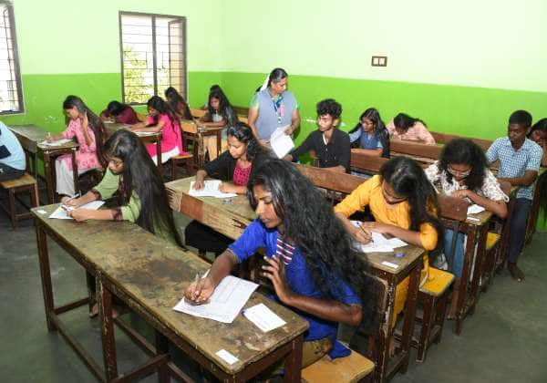 விழுப்புரம் ஜெயேந்திர சரஸ்வதி வித்யாலயா மணிவிழா மெட்ரிக் மேல்நிலைப் பள்ளியில் தினமலர் சார்பில் நடந்த நீட் மாதிரி தேர்வை ஆர்வமுடன் எழுதும் மாணவ, மாணவிகள்.