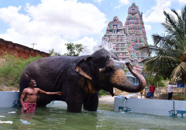 சிவகங்கை மாவட்டம் காளையார் கோவில் சொர்ண காளீஸ்வரர் கோயிலில் சொர்ணவல்லி யானைக்கு தனியாக நீச்சல் குளம் கட்டப்பட்டுள்ளது. அதில் ஆனந்த குளியல் ஆடிய யானை.