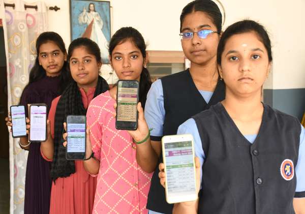 பிளஸ் 1 வகுப்பு பொது தேர்வு முடிவுகள் வெளியானது. மார்க் எவ்வளவு என பார்க்கும் மாணவிகள். இடம் கோவை