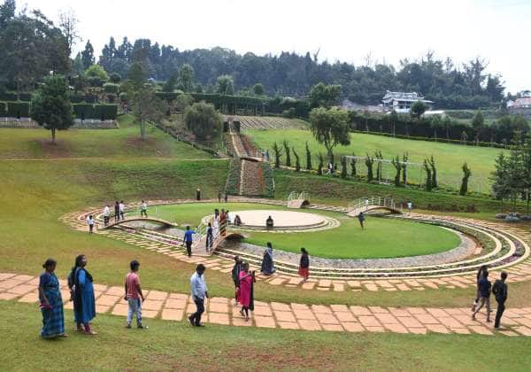 ஊட்டி பர்ன்ஹில் பகுதியிலுள்ள, கர்நாடக தோட்ட கலைத்துறை பூங்காவில், ரசித்து செல்லும் சுற்றுலா பயணிகள்.