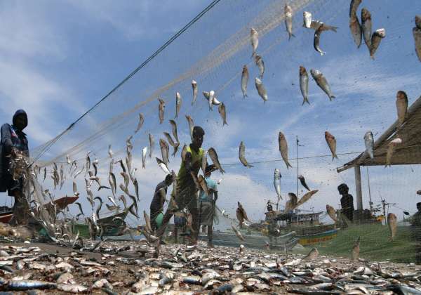 சென்னை காசிமேடு மீன்பிடி துறைமுகத்தில் பைபர் படகுகளின் பிடித்து வரப்பட்ட மீன்களை வளையில் இருந்து பிரித்தெடுக்கும் பணியில் ஈடுபட்டுள்ள மீனவர்கள்.