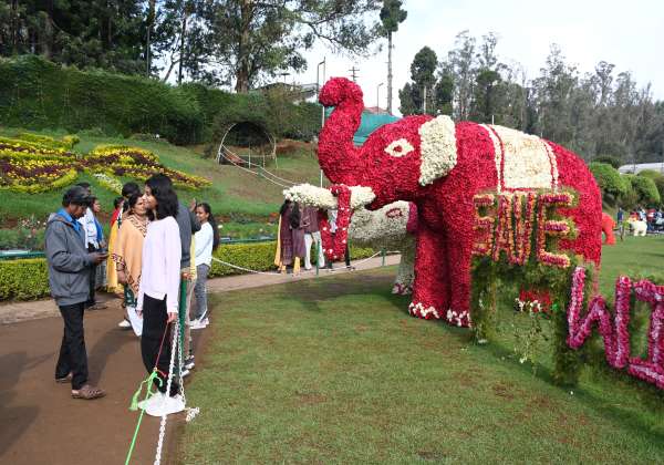 ஊட்டி ரோஜா பூங்காவில் ரோஜாக்களால் உருவாக்கப்பட்ட யானை உருவம் முன்பு படம் எடுக்க சுற்றுலா பயணிகள் அதிக ஆர்வம் காட்டினர்.