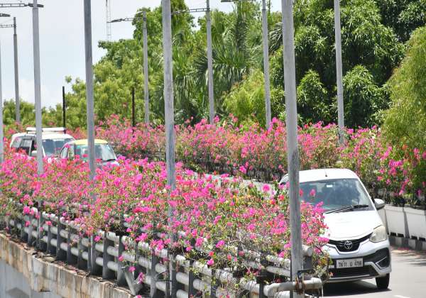 சென்னை, விமானநிலைய வளாகத்தில் காண்போரை கவரும் வகையில் பூத்துக்குலுங்கும் காகித பூக்கள்.