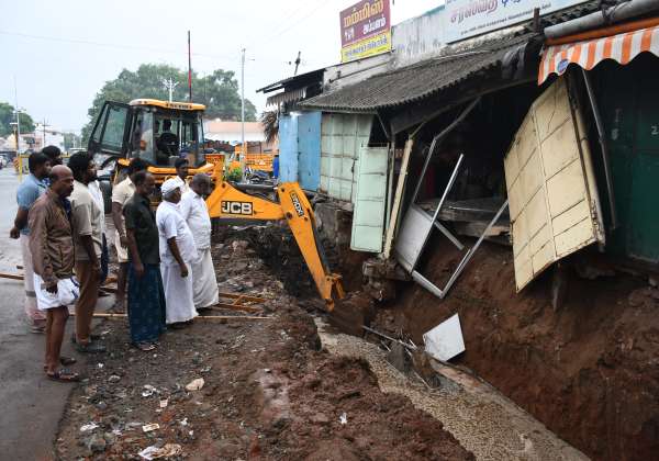 பொள்ளாச்சி மார்க்கெட் ரோட்டில், மழை நீர் வடிகால் கட்டுவதற்காக நெடுஞ்சாலை துறை அதிகாரிகள் குழி தோண்டும் போது கடையின் முகப்பு பகுதி கீழே இறங்கியது.
