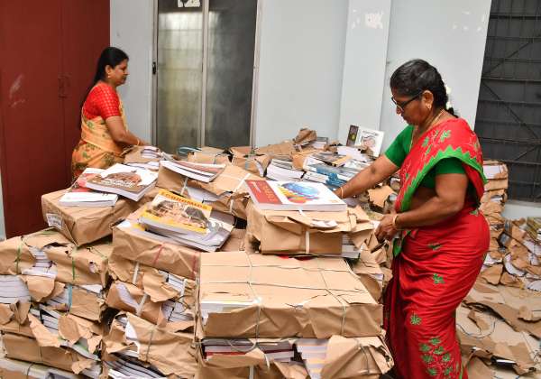 கோடை விடுமுறை முடிந்து பள்ளிகள் திறக்கப்பட உள்ள நிலையில், மாணவர்களுக்கு வழங்கப்பட உள்ள புத்தகங்களை அடுக்கி வைக்கும் பணியில் ஈடுபட்டுள்ள ஆசிரியர்கள். இடம் : மாநகராட்சி பெண்கள் மேல்நிலைப் பள்ளி, ஷெனாய் நகர்