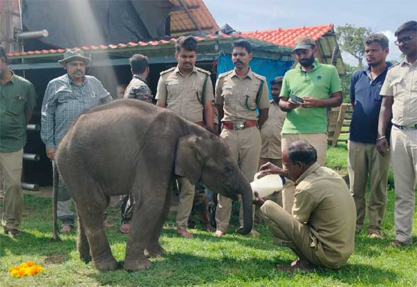 கோவை மாவட்டம், மருதமலை அருகே, தாயை பிரிந்த, 4 மாத ஆண் குட்டி யானை, பராமரிப்புக்காக இன்று முதுமலை புலிகள் காப்பகம் தெப்பக்காடு யானைகள் முகாமில், ஒப்படைக்கப்பட்டது.