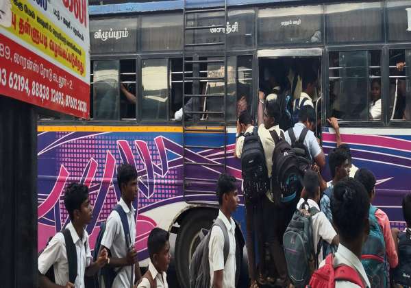 போலீசார் எச்சரிக்கை செய்தும் கூட மாணவர்கள் அதைக் கண்டு கொள்வதில்லை. பஸ்ஸில் படியில் தொங்கியபடி பயணம் செய்வது தொடர்கிறது. இடம். கடலூர் போஸ்ட் ஆபீஸ்.