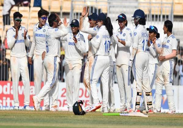 இந்தியா - தென் ஆப்ரிக்கா பெண்கள் கிரிக்கெட் டெஸ்ட் போட்டியில் தென் ஆப்ரிக்கா அணியின் சுன் லூசின் விக்கெட்டை வீழ்த்திய மகிழ்ச்சியை கொண்டாடிய இந்திய அணியினர். இடம் : சேப்பாக்கம், சென்னை
