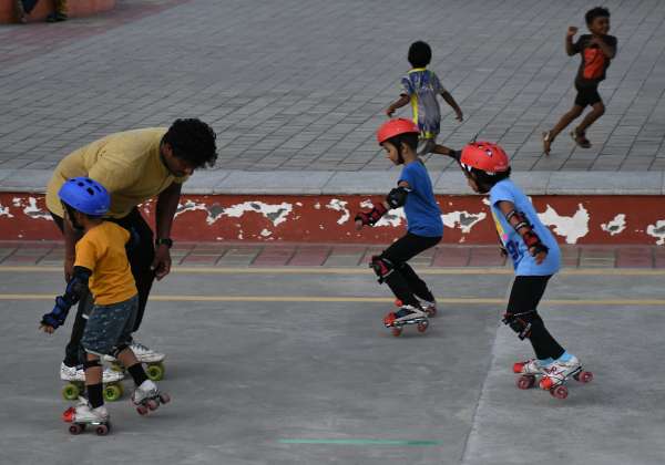 சென்னை 2.0 திட்டத்தின் கீழ் மாநகராட்சி சார்பில் மின்சார ரயில் மேம்பாலம் அருகில் அமைக்கப்பட்ட பூங்காவில் உள்ள மைதானத்தில் ஸ்கேட்டிங் பயிற்சி செய்யும் குழந்தைகள். இடம் : திருவான்மியூர்.