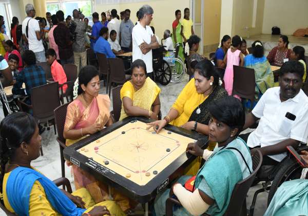 மதுரையில் ஜி.எம்.எஸ்.பவுண்டேஷன் சார்பில் மாற்றுத்திறனாளிகளுக்கான கதம்ப விழாவில் கேரம் போட்டி நடந்தது.